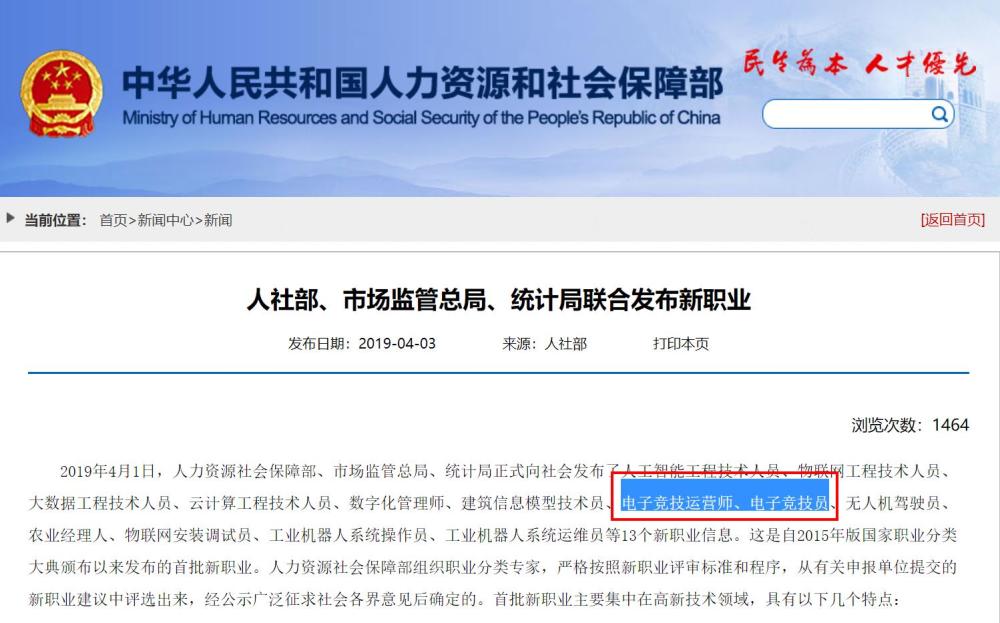 4月1日,人力资源社会保障部、市场监管总局、统计局正式向社会发布了13个新职业信息,其中就有游戏玩家和电子竞技观众最为熟悉的电子竞技运营师、以及电子竞技员。这意味着电子竞技产业中,处于核心位置的电竞运动员、教练、运营等岗位被人力保障部门承认为正式职业,可以得到更多的社会支持。