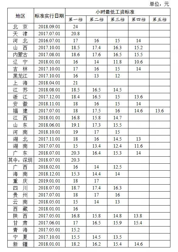 全国各地区小时最低工资标准情况(截至2019年3月)
