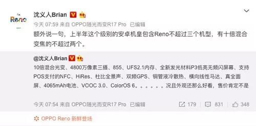 【TechWeb】4月6日,OPPO副总裁沈义人今日一早在微博上公布了Reno 10倍混合变焦版的详细规格。