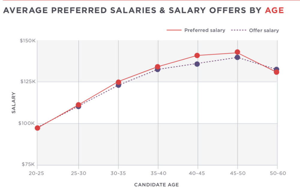 2017年技术员工年龄 vs 薪水方面的数据。由Hired.com提供
