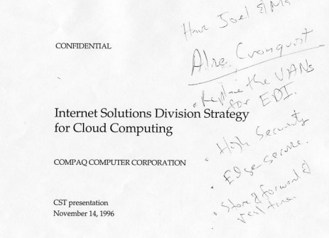 1996年,康柏公司的一群技术主管在讨论计算业务的发展时首次使用了Cloud Computing这个词[11],他们认为商业计算会向Cloud Computing转移。