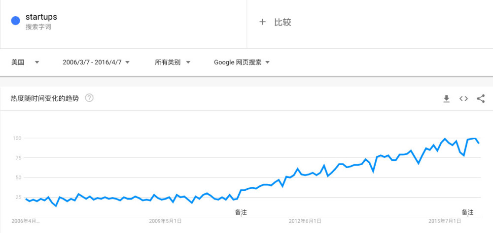 最后从外部环境来看,AWS正好赶上了互联网一波创业浪潮,举几个他的典型客户,Yelp成立于2004年,Zynga成立于2007年,Airbnb 成立于2008年,Slack成立于2009年,Lyft成立于2012年……或许从下面两张图片看这点更有统计意义,startups的流行曲线与AWS早期具有非常高的相关度。