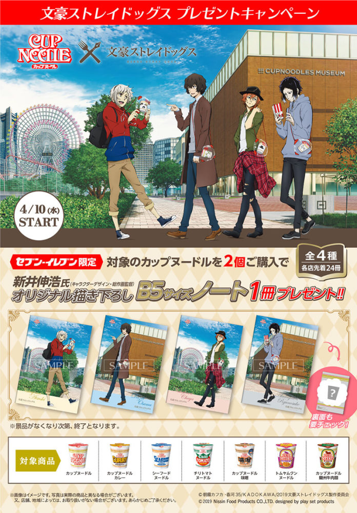 《文豪野犬》是由朝雾卡夫卡担任原作,春河35负责作画,自2013年1月号起在角川书店旗下月刊漫画杂志《YOUNG ACE》上连载的漫画。最近《文豪野犬》宣布将与CUP NOODLE合作。为了宣传本活动,动画角色设计新井伸浩还专门绘制了一幅新视觉图,图中出现了中岛敦(CV:上村祐翔)、太宰治(CV:宫野真守)、芥川龙之介(CV:小野贤章)、中原中也(CV:谷山纪章)共四名主要角色。联动将于4月10日正式开始,购买两款指定杯面就可以获赠一份笔记本周边。