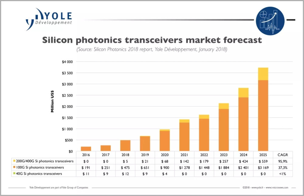 据市场研究机构Yole在2018年对外公布的对硅光子的预测显示,虽然2017年70亿美元的光模块市场,硅光只有2.6亿美元,但Yole预测到2025年,硅光模块将达到36.7亿美元,占整个光模块市场的35%。