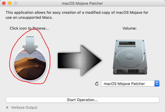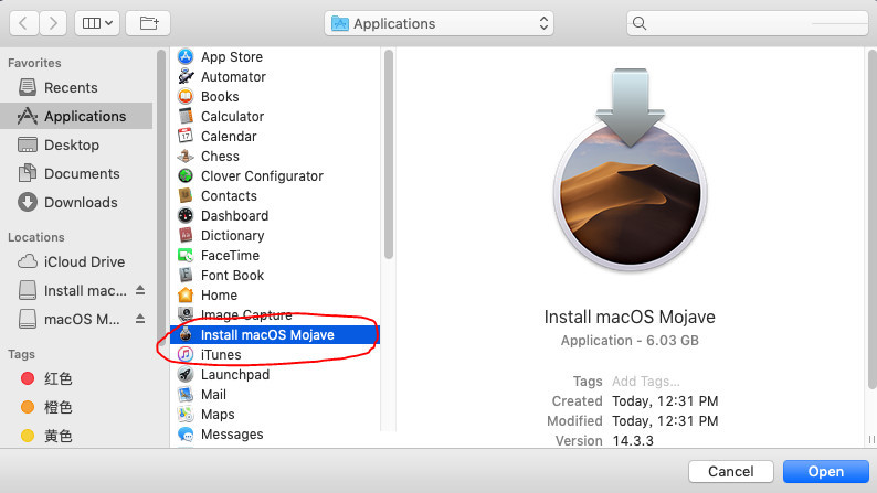 首先是macOS Mojave Patcher,点击左边的icon,跳出选择安装app,我们选择/Application/Install macOS Mojave,点击打开。