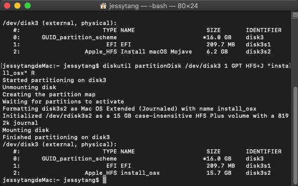diskutil是磁盘管理命令,partitionDisk表示对目标磁盘进行格式化,/dev/disk3则是U盘对应的硬件名(因为在Unix下任何硬件都对应着一个文件),1表示除EFI分区外只留下一个分区,GPT意味着使用GUID分区图,HFS+J使用HFS分区文件系统,install_osx则是格式化后的分区名。输出结果如图所示:我们已经创建了一个200M+的EFI分区(苹果引导EFI区必须要大于200M)和一个15.7GB的分区。