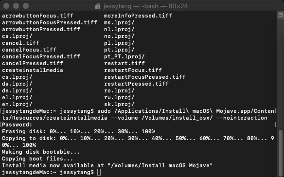 sudo /Applications/Install macOS Mojave.app/Contents/Resources/createinstallmedia --volume /Volumes/install_osx --nointeraction