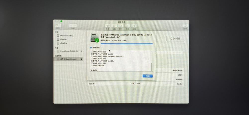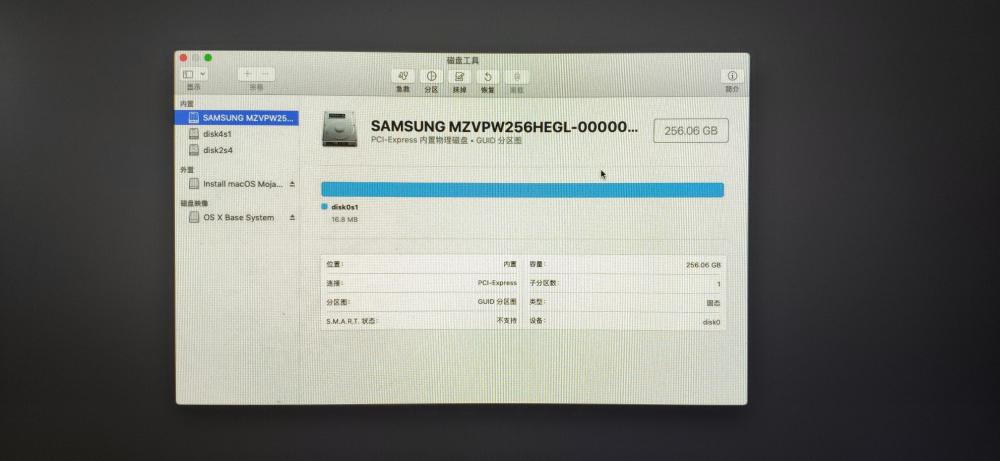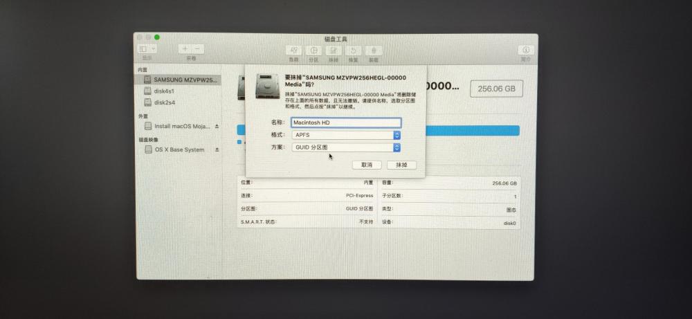 在磁盘工具里我们可以发现除了Windows下的两块SATA硬盘被标注为disk1s1(机械硬盘,disk1表示第一块硬盘,因为在插主板SATA口的时候更靠前,s1表示第二个分区,第一个分区为GPT格式默认有的EFI分区)和disk2s4(Windows所在磁盘分区)之外,还有一个SAMSUNG开头的大小为256G的PCI-E磁盘,这就是我们要安装的地方,选择最上方抹掉按钮。