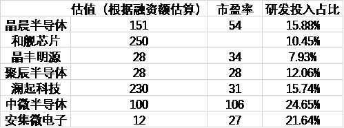 这些拟在科创板上市的半导体和集成电路企业普遍重视研发,研发投入占营收的比重都在10%以上,其中中微半导体最高,为24.65%。同时根据融资金额估算公司估值,中微半导体的市盈率也是最高的,达到106倍。以下为部分企业的基本情况。
