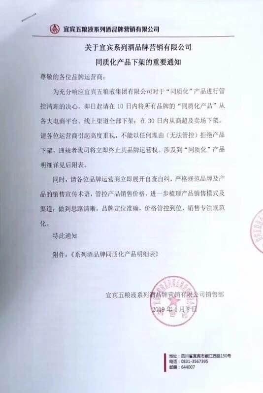 4月8日,宜宾五粮液系列酒品牌有限公司销售部下发《关于宜宾系列酒品牌营销有限公司同质化产品下架的重要通知》。《通知》称,即日起在10日内将所有品牌的“同质化产品”从各大电商平台、线上渠道全部下架;在30日内从商超及卖场下架,各运营商不能以任何理由(无法管控)拒绝产品下架,违规者将被终止品牌运营权。