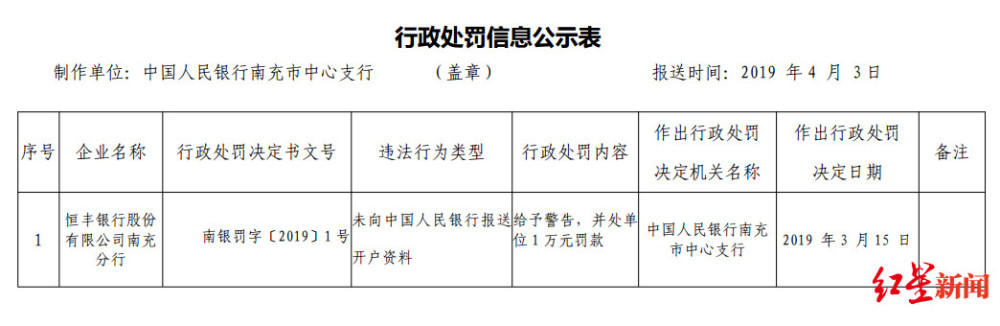 根据处罚信息显示,恒丰银行南充分行因未向人民银行报送账户开立资料,人民银行南充中心支行对其进行警告,并处罚款1万元。