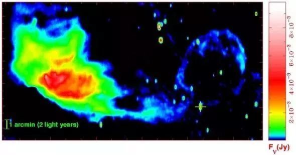 这是一张天鹅座X-1的无线电波段图像,打叉的位置标示出黑洞的位置。图像左侧(东侧)是一团稠密的气体云,属于星际尘埃物质。天鹅座X-1中的黑洞发出的强大喷流已经在这些气体云中吹出了一个“气泡”,向黑洞的北侧和西侧(右侧)膨胀。