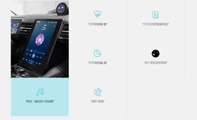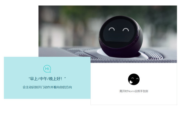NOMI是“kown me(了解我)”的谐音,它其实是个放在中控台上圆形小机器人。能根据语句与车主对话,并做出各种有趣表情。这个小机器人可控制车玻璃升降,天窗开合之类,还能负责放音乐,讲笑话之类,但是不能干涉驾驶(动力部分)。灵巧之处表现在各种灵活的设定上,比如不用说“把空调开到多少度”之类,直接对它说“NOMI我有点冷”,它会把车内温度调高到一个比较合适的程度。而NOMI的智能语音系统是经过科大讯飞认证过的,代表了目前我们在汽车上能体验到最好的语音交互之一了。