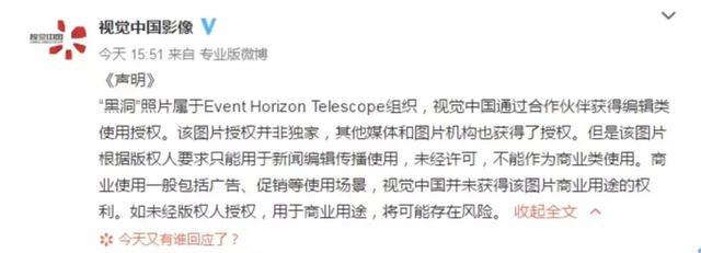 在各种版本的回应之后,视觉中国在其官方微博上发布了关于此事的正式声明。声明称,“黑洞”照片属于Event Horizon Telescope组织,视觉中国通过合作伙伴获得编辑类使用授权。
