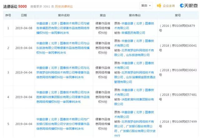 天眼查显示,法人为视觉中国创始人柴继军的华盖创意(北京)图像技术有限公司拥有5000条法律诉讼记录,2643条开庭公告,绝大多数为侵害作品信息网络传播权纠纷。