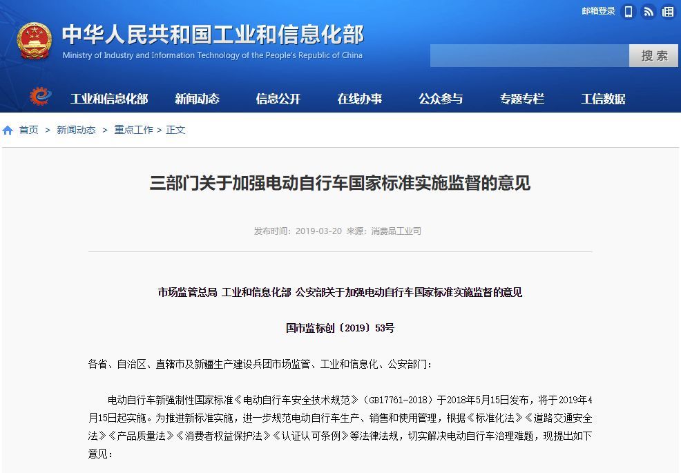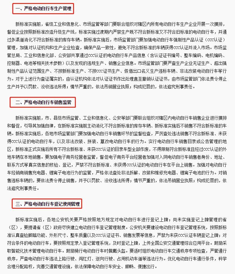 对此,工信部迅速做出了反应,推出了相关的规管措施——《三部门关于加强电动自行车国家标准实施监督的意见》。