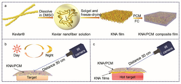 此次研究中,技术人员想要发明出一种可以适应不断变化的温度,且不需要额外耗能的红外隐身材料。他们首先制造了一种坚固但柔软的纳米纤维气凝胶薄膜,这种薄膜具有优异的隔热性能。将这种薄膜用相变材料聚乙二醇(PEG)浸泡并进行防水处理,就得到一种轻薄、坚固、柔韧,但红外隐身性能优异的复合新材料。