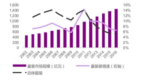 2002~2016年我国童装市场规模及增速