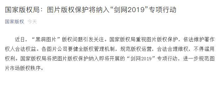 近日,“黑洞图片”版权问题引发关注。国家版权局重视图片版权保护,依法维护著作权人合法权益。各图片公司要健全版权管理机制,规范版权运营,合法合理维权,不得滥用权利。国家版权局将把图片版权保护纳入即将开展的“剑网2019”专项行动,进一步规范图片市场版权秩序。