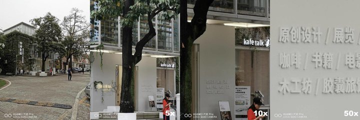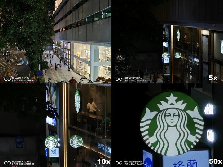 从这组变焦样张中能够看到,P30 Pro 在进行 5 倍到 10 倍的变焦时,画面能够保持原有的画面清晰度,星巴克灯箱中的细节也能清晰还原。P30 Pro 此时对高光有一定的压制,所以不灯箱不会因为明显的高光过保而丢失细节。