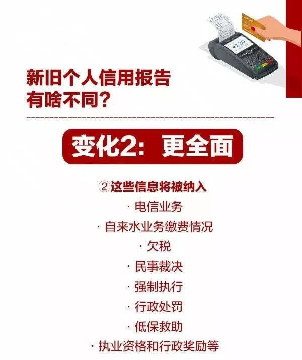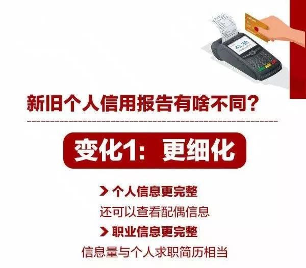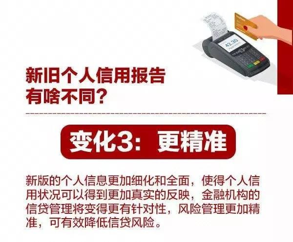 变化三:更精准。新版的个人信息更加细化和全面,使得个人信用状况可以得到更真实的反映,金融机构的信贷管理将变得更有针对性,风险管理更加精准,有效降低信贷风险。