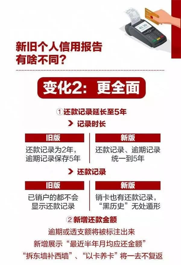 变化二:更全面。例如,新版个人征信还款记录延长至5年,将记录详尽的还款信息、逾期信息,已销卡用户也会有还款记录,让“黑历史”无处遁形;新增展示“最近半年月均应还金额”,拆东墙补西墙、以卡养卡将一去不复还。