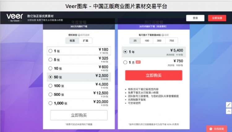 根据网站介绍,VEER有年订阅套餐和月订阅套餐两类。其中,年套餐显示,365天内随时下载的扩展授权的照片,1张价格为600元,5张为2900元,10张为5500元,而50张则为25000元。这意味着,每张图片的价格在500至600元。