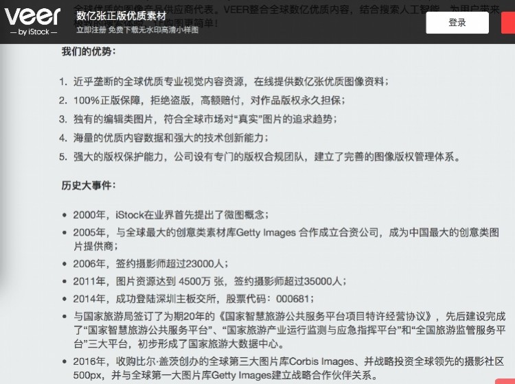 根据VEER的“历史大事件”显示,2005年,与全球最大的创意类素材库Getty Images 合作成立合资公司,成为中国最大的创意类图片提供商;2006年,签约摄影师超过23000人;2011年,图片资源达到 4500万 张,签约摄影师超过35000人;2014年,成功登陆深圳主板交所,股票代码:000681;2016年,收购比尔·盖茨创办的全球第三大图片库Corbis Images、并战略投资全球领先的摄影社区500px,并与全球第一大图片库Getty Images建立战略合作伙伴关系。