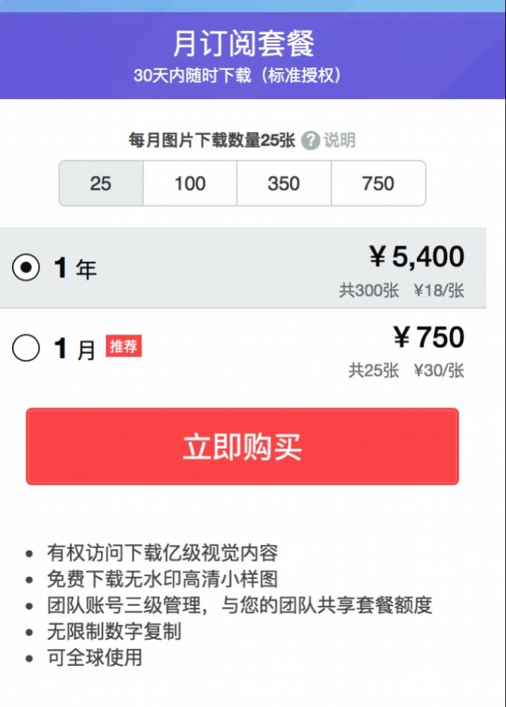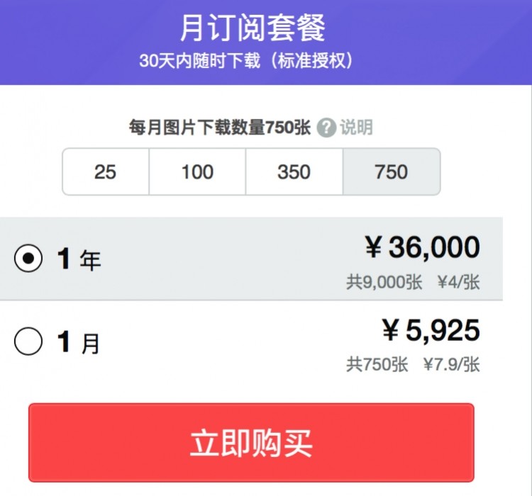另一种方式是月订阅套餐。南都记者查阅获悉,按每月下载25张计算,1个月750元,相当于30元/张;每月图片下载100张的价格为2000元,相当于每张20元。假设1个月下载750张照片,每张7.9元,合计5925元。