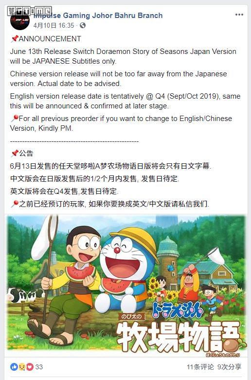 根据马来西亚游戏零售商 Impulse Gaming 的消息显示,6 月 13 日发售的《哆啦A梦 牧场物语》日版仅包含日语字幕,中文版会在日版一两个月之后发售,具体时间待定。
