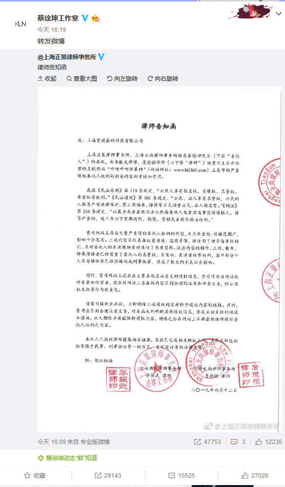 12日下午,上海正策律师事务所微博发布了受蔡徐坤委托,向上海宽娱数码科技有限公司发送的律师告知函,称其运营的哔哩哔哩(B站)网站存在大量侵犯委托人权力的的内容,影响恶劣。蔡徐坤工作室随后转发了该微博。
