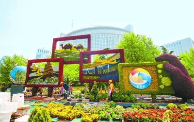 昨天,在朝阳门桥东南角,园林工人在布置主题花坛,迎接即将在北京举办的第二届“一带一路”国际合作高峰论坛。