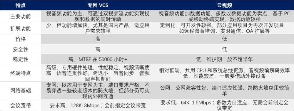 与云视频相对应的是VCS(Video conferphone system),也即会议电视系统,其需要的设备更复杂,厂商竞争更激烈,通常需要搭建专网以及专业的设备,即需要自建视频会议系统,并需要专人维护,这一领域的客户主要是对安全性需求较高的政府以及一些大型企业。