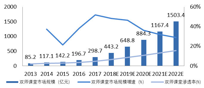 2017年,我国基础教育双师课堂市场规模达到298.7亿元。在民营教育机构及政府大力推行双师教育、教育资源共享的两大利好背景下,未来几年双师课堂市场规模超千亿。