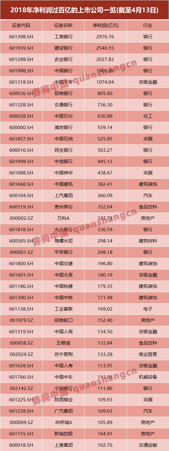 截至4月13日,两市共有1545家上市公司发布2018年年报,其中净利润过百亿的上市公司仅37家,占比仅2.39%。