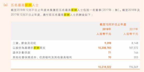 根据4月8日小米集团披露的2018年财报,报告期内,集团前五名最高薪酬人士共获得酬金102.18亿元(非特别注明均为人民币,下同),相比于2017年的1.96亿元,同比增加50倍。其中,以股份为基础的薪酬开支共计102.09亿元,占比高达99.9%。