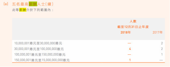 具体来看,在这五名最高薪酬人士中,其中年薪较低的4人薪酬介于3000万元至1亿元港币之间,另外1人薪酬最高,介于1.5亿元至150亿元港币之间。如果按照4人年薪最高1亿元港币计算,则4人薪酬总共约合人民币3.42亿元。这就意味着,另外那名收入最高人士的薪酬高达98.76亿元!