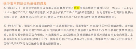 2018年4月2日,雷军及其家属为受益人信托持有其权益的实体Smart Mobile Holdings Limited获发一批小米B股约6.4亿股,价值约98.27亿元;2018年6月17日,雷军获受小米旗下小米金融4207万份购股权,认购价为3.8325元,价值约1.03亿元;两项合计约99.30亿元。