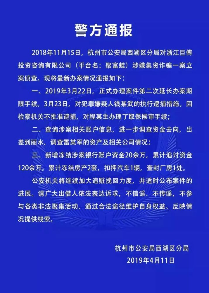 1、聚富蛙:4月11日,西湖区公安分局对外通报聚富蛙涉嫌集资诈骗一案最新进展,新增冻结涉案银行账户资金20余万,累计追讨资金120余万。累计冻结房产2套,扣押汽车1辆,查封厂房1处。