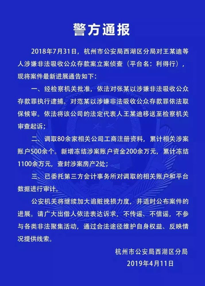 2、利得行:4月11日,西湖区公安分局对外通报利得行涉嫌非法吸收公众存款案最新进展,已调取80余家相关公司工商注册资料,累计相关涉案账户500余个。新增冻结涉案账户资金200余万元,累计冻结1100余万元,查封涉案房产2处。