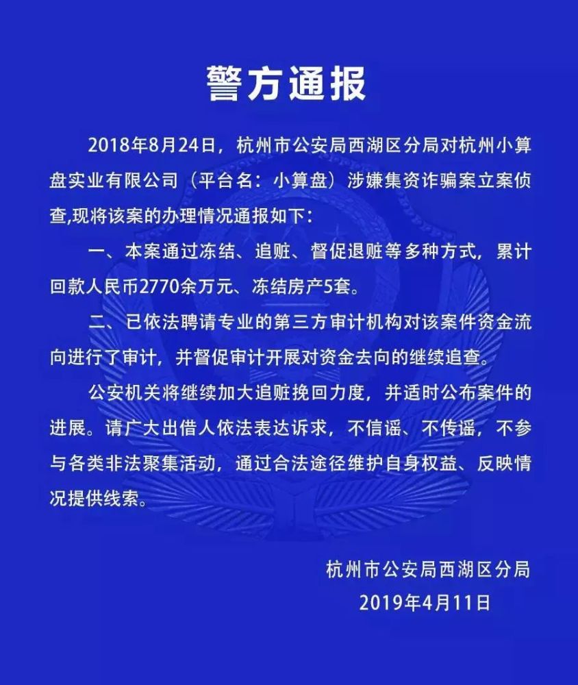 3、小算盘:4月11日,西湖区公安分局对外通报小算盘涉嫌集资诈骗案最新进展,截至目前,本案通过冻结、追赃、督促退赃等多种方式,累计回款人民币2770余万元、冻结房产5套。