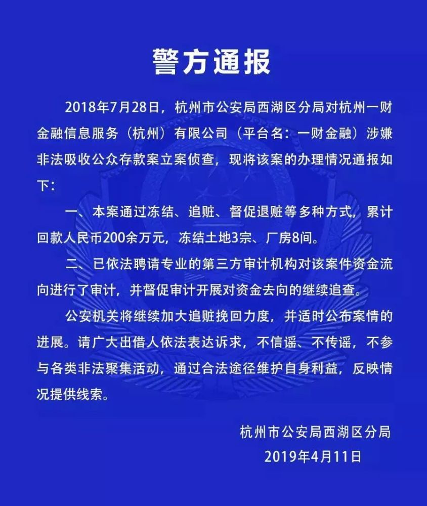 4、一财金融:4月11日,西湖区公安分局对外通报一财金融涉嫌非法吸收公众存款案最新进展,目前本案通过冻结、追赃、督促退赃等多种方式,累计回款人民币200余万元,冻结土地3宗、厂房8间。