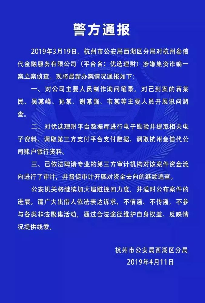 5、优选理财:4月11日,西湖区公安分局对外通报优选理财涉嫌集资诈骗一案最新进展,对公司主要人员制作询问笔录,对已到案的蒋某民、吴某峰、孙某、谢某强、韦某等主要人员开展讯问调查。