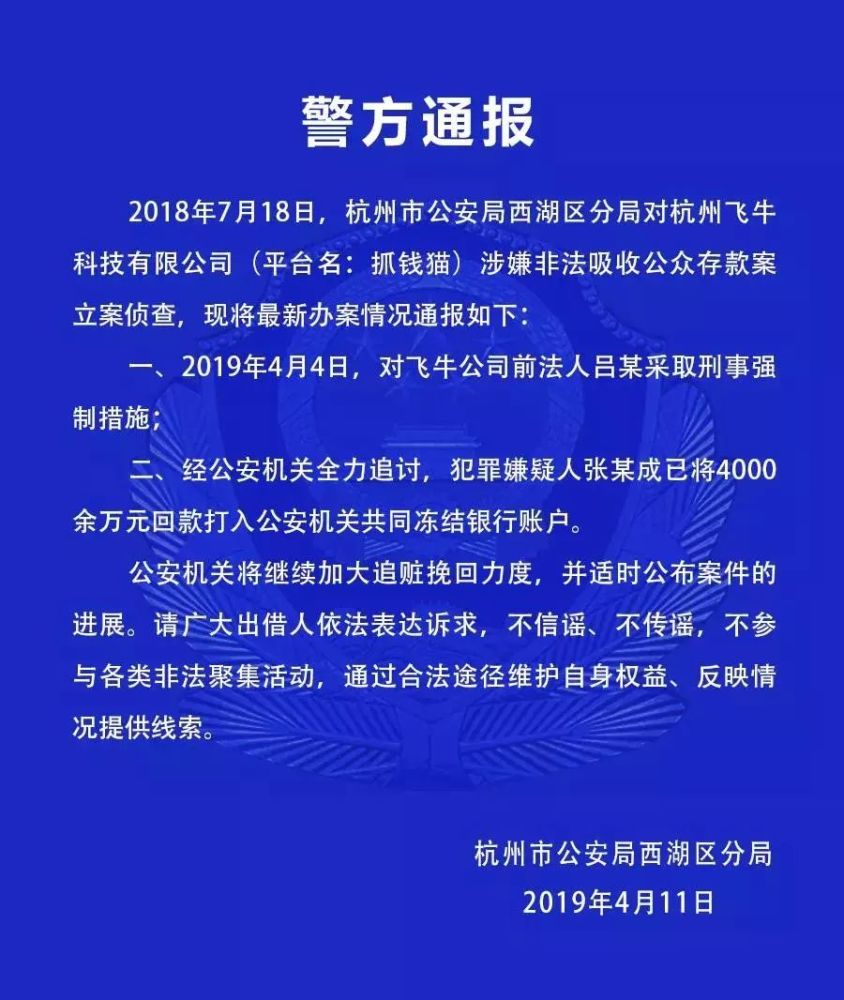 6、抓钱猫:4月11日,西湖区公安分局对外通报抓钱猫涉嫌非法吸收公众存款案最新进展,经公安机关全力追讨,犯罪嫌疑人张某成已将4000余万元回款打入公安机关共同冻结银行账户。