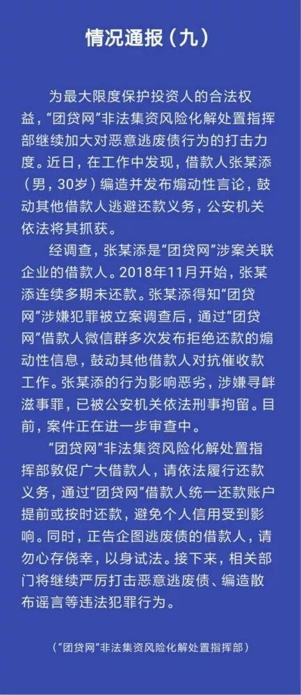 4月13日,东莞公安局发布“团贷网”最新进展情况通报(九)。通报指出,为最大限度保护投资人合法权益,“团贷网”非法集资风险化解处置指挥部继续加大对恶意逃废债行为的打击力度。在近日工作中,公安机关依法抓获一借款人张某添(男,30岁),因其编造并发布煽动性言论,鼓励其他借款人逃避还款义务。目前,案件正在进一步审查中。