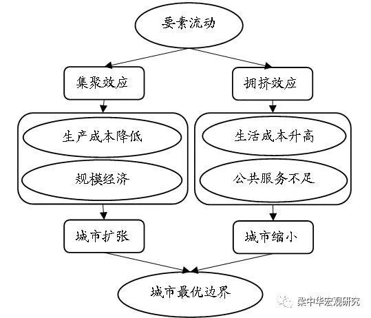 集聚效应和拥挤效应决定城市最优边界。城市发展存在两个相反的效应:集聚效应(agglomeration effect)和拥挤效应(congestion effect)。人口集聚会带来生产成本的降低并可能存在规模经济,因此人口集聚带来人均收入水平的提高,进而吸引人口流入而产生集聚效应。