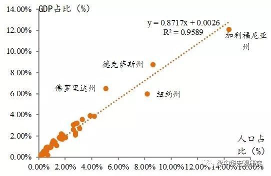 图表:美国各州GDP占比与人口占比(%)
