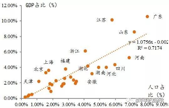 而人口的充分流动,也有助于缩小区域间的收入差距。收入水平的差异是驱动人口流动的主要动力,所以人口流动会朝着缩小收入差距方向发展。例如美国各州GDP占全国的比重,和人口占比几乎是一个线性的关系,这说明各州之间人均收入差距并不大。而我国各省GDP占比和人口占比并不相匹配,说明各地区的收入差距较大,也从侧面表明,我国地区间的人口流动依然不够充分。