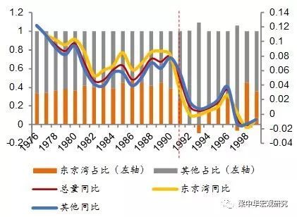 东京湾也成为日本国内经济的增长引擎。从1976至1990年,东京湾GDP增长速度领先全国,经济增量占全国经济增量比重常年保持在35%以上,与此同时人口不断积聚。