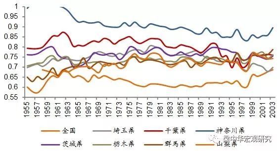区域内收入差距缩小,绝对水平高于全国。东京湾区建设初期,山梨县人均收入仅为东京的60.1%,神奈川基础较好,与东京收入水平接近。随着区域一体化的推进,到1989年,除神奈川外,其余城市的收入水平均提高至东京的70.5%到77.5%之间,并高于全国平均水平。